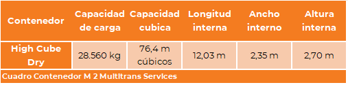 Las medidas y la capacidad específicas de los contenedores High Cube Dry pueden variar en función del fabricante, el tiempo de uso (primera o segunda mano). Las especificaciones más comunes son: