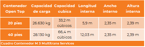Las dimensiones y la capacidad específicas de los contenedores Open Top pueden variar en función del fabricante, la edad y el propietario del contenedor. Sin embargo, las especificaciones enumeradas a continuación son representativas de la mayoría de los contenedores Open Top.