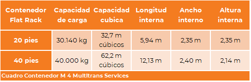 Las medidas y la capacidad específicas de los contenedores Flat Rack pueden variar en función del fabricante. Las especificaciones que se indican a continuación son las más representativas del contenedor Flat Rack.