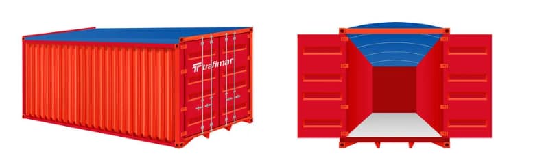 Los Open top container o contenedores Open top cuentan con techo removible de lona en lugar de un techo sólido. Están especialmente diseñados para el transporte de cargas pesadas o de grandes dimensiones como madera o chatarra. Se cargan desde la parte superior.